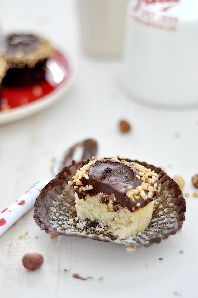 Hacemos un agujero central en el cupcake, rellenamos con la avellana y con ayuda de una manga pastelera cubriremos de nutella. Tapamos el agujero con un poco de bizcocho.