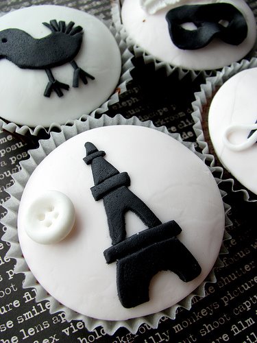 Con unos discos blancos con estos divertidos dibujos que evocan la Ciudad de la Luz quedan geniales, es una decoración fácil y muy resultona, además solo necesitaremos pasta de azúcar y un rotulador de tinta comestible.