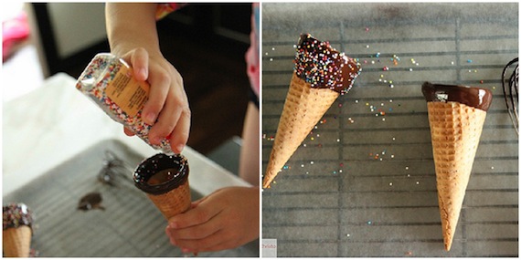 Sólo tenéis que atemperar un poco de chocolate, mojar vuestro cucurucho en el y rociarlo con sprinkles de colores para conseguir un efecto alegre y colorido.