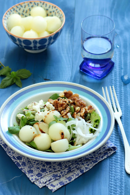 Ensalada de melón con nueces, hierbabuena y queso. Receta