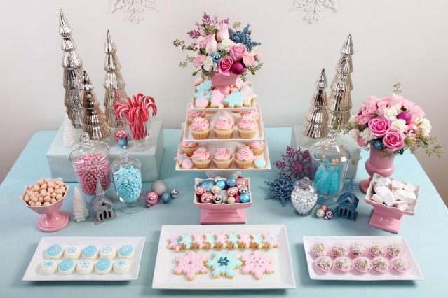 Así, en Karas’s Party nos dan esta idea, toda la decoración en rosas, celestes..la combinación es preciosa y llena de detalles. El brillo navideño lo aportan abetos plateados, perlas, purpurinas,..