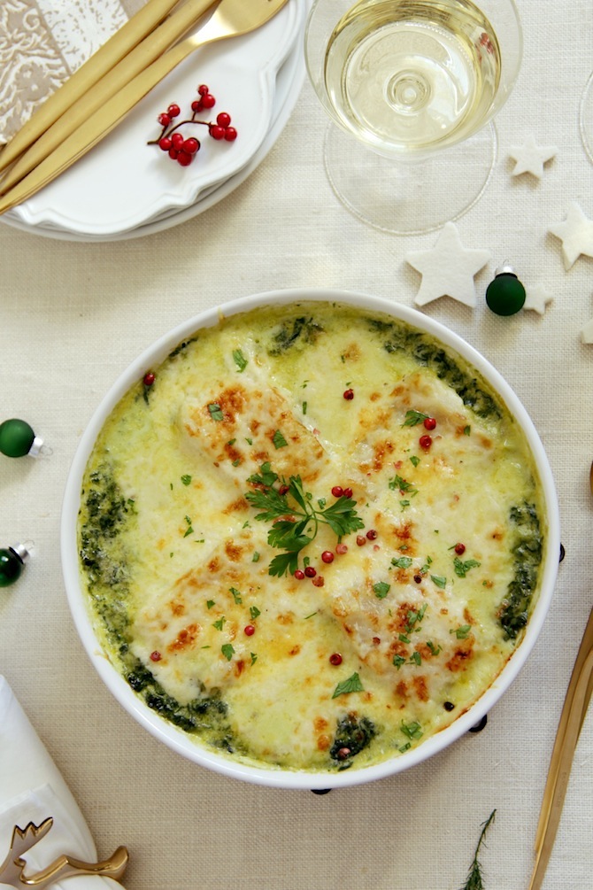 Gallos horneados con salsa de espinacas, bechamel y queso. Recetas de Navidad