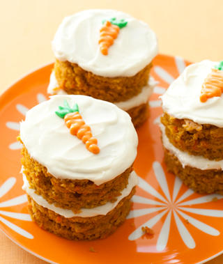 En forma de pastelitos individuales y con unas divertidas zanahorias de crema..esta forma de presentarlo me encanta, incluso con una simple nuez estaría perfecto.
