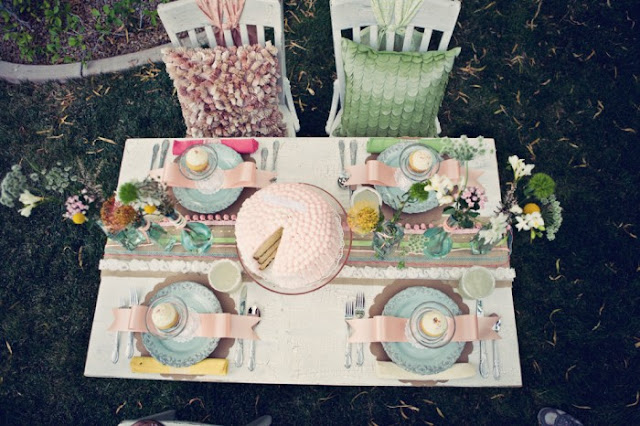Esta es la propuesta de Amy Atlas: una bonita tarta ruffle con unos cupcakes servidos de forma individual, acompañando con la decoración de toque vintage.