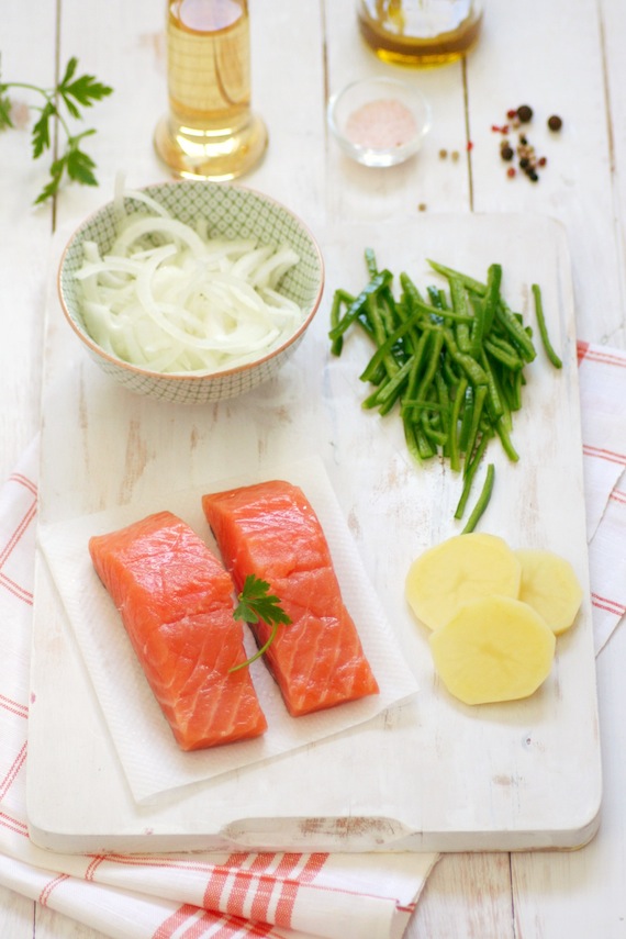 Forramos un molde con papel de horno y disponemos sobre él un cama de patatas, otra de cebolla y una de pimientos, ponemos los lomos de salmón encima, salpimentamos y regamos con el vino blanco y el aceite de oliva.