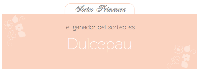 Y el ganador del sorteo primavera es… Ya tenemos ganador en nuestro sorteo de primavera, ha sido para Dulcepau, ¡¡enhorabuena!! Gracias a todos por vuestra participación, en breve organizaremos nuevos sorteos * a la ganadora: envíanos tu nombre y dirección de correo a nuestro correo electrónico. Gracias Responder a Raquel Carmona Cancelar respuesta Tu dirección de correo electrónico no será publicada. Los campos necesarios están marcados * Nombre * Correo electrónico * Web Comentario Puedes usar las siguientes etiquetas y atributos HTML: <a href="" title=""> <abbr title=""> <acronym title=""> <b> <blockquote cite=""> <cite> <code> <del datetime=""> <em> <i> <q cite=""> <strike> <strong>
